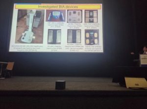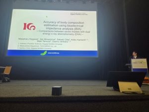香川副所長・教授は、「栄養学における基礎科学(Basic Science in Nutrition)」一般演題セッションで、「Accuracy of body composition estimation using bioelectrical impedance analysis (BIA) – Comparisons between seven models with dual energy x-ray absorptiometry (DXA) – (和訳:生体電気インピーダンス法(BIA)を用いた体組成推定の正確性-二重エネルギーX線吸収法(DXA)と7つのモデルの比較)」の演題で発表を行いました。この研究では、日本人女子大学生約50名を対象に、異なる数の電極や周波数を用いた研究用から家庭用までの7台の体組成計から得られた値を、より正確とされるDXAを用いて検証しました。本研究は東洋メディック株式会社との共同研究として実施されました。