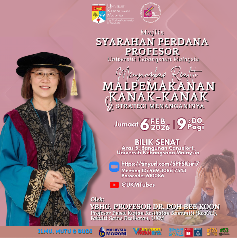 2月9日に本学が包括的学術連携を結んでいるUniversiti Kebangsaan Malaysia (UKM:マレーシア国立大学)のProf. Bee Koon Pohの教授就任講演がUKMで開催されました。Prof. Pohと香川副所長は約20年に亘り交流があり、共同研究を行ってきたほか、Prof. Pohや共同で指導していた大学院生を本研究所で受け入れました。今回の記念すべき講演会と同時に開催された研究業績の展示会では、本学及び本研究所との繋がりについても紹介され、香川副所長の挨拶動画が上映され、元院生による本学での留学生活を紹介する資料が展示されました。